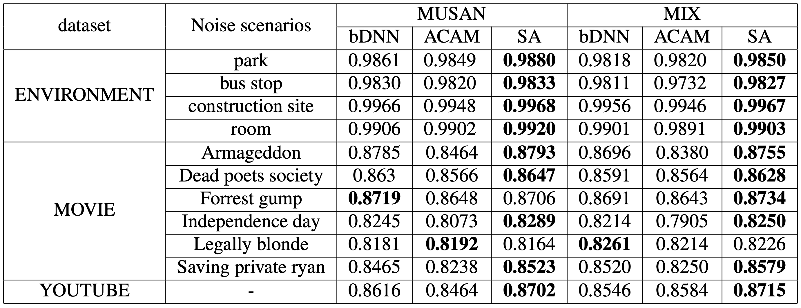 * MUSAN은 MUSAN corpus만 noise로 사용한 단일 시나리오 학습의 결과이며, MIX는 위에 언급한 4개의 noise corpus를 사용한 복합 시나리오 학습의 결과이다.