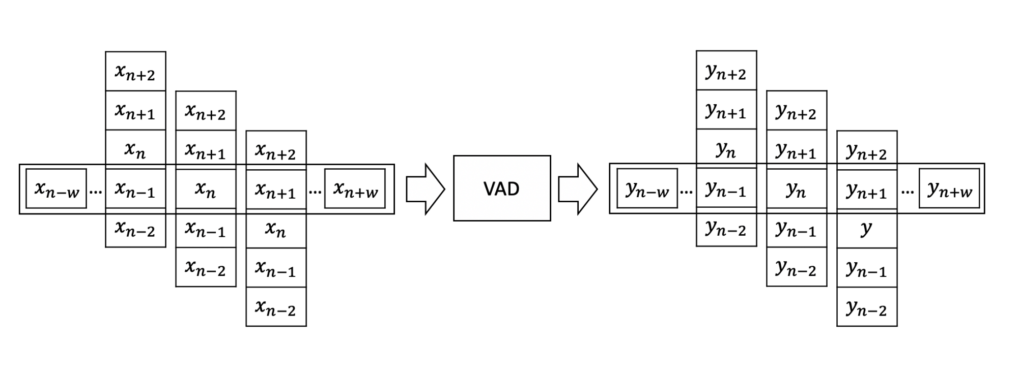 이번 논문 SELF-ATTENTIVE VAD: CONTEXT-AWARE DETECTION OF VOICE FROM NOISE에서 제안하는 것은 셀프 어텐션 기반의 VAD이다. 이전의 논문들에서 제안하였던 bDNN, ACAM 등의 아키텍쳐는 모두 acoustic frame 레벨에서 contextual information을 모델링하는 것에 초점을 두고 있었다. contextual information이란 한국어로 번역하면 문맥 정보인데, 각 음성 파일 안에서 어떤 특정 프레임이 음성인지 아닌지를 판단할 때에 사용하는 다른 frame의 정보 정도로 이해될 수 있다. 제출 논문에서는 self attention 아키텍쳐가 다른 아키텍쳐보다 contextual information을 토대로 특정 frame이 음성인지 아닌지를 판단하는데에 효율적이라는 것을 입증하는 데에 초점을 맞췄다. 논문에서 제안하는 self attention 기반의 VAD는 기존 transformer의 encoder와 형태가 같다. 구조적으로 한가지 다른 점이라면 출력단의 결과물을 가지고 바로 분류하는 것이 아니라 bDNN에서 사용하였던 boosted classifier라는 구조를 이용하여, 다양한 contextual information에서 추출된 frame의 결과물의 평균값을 토대로 음성/비음성을 분류한다. 그 결과 n개의 음성 frame을 입력으로 받아 n개의 출력을 얻고, 다시 슬라이딩하여 n개의 음성 frame을 입력으로 받고, n개의 출력을 얻은 후, 최종적으로는 특정 frame의 평균값을 이용하여 그 frame이 음성인지 아닌지를 분류하게 된다.